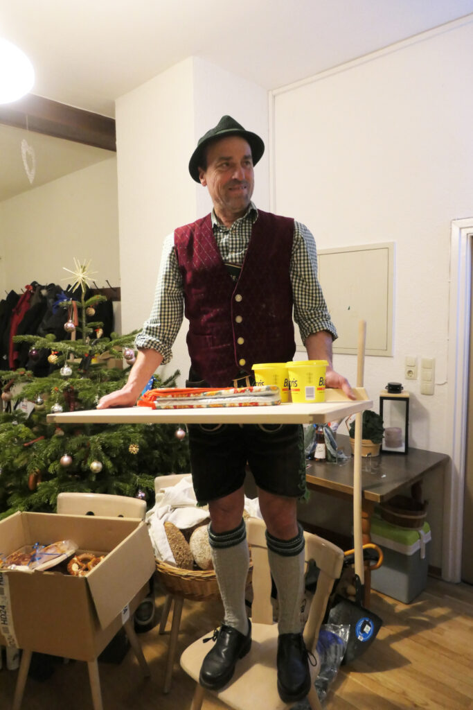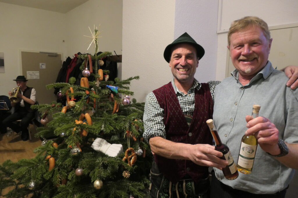 Zum Schluss wurde der Baum als solcher versteigert, verschiedene Brotzeiten und Wein wechselten den Besitzer, Zweig für Zweig, behängt mit Würsten, Brezen, Schnaps, Arbeitshandschuhe wurden abgezwickt. Nachdem der Baum als solcher dreimal zurückgegeben wurde, ging der letzte Zuschlag zusammen mit dem restlichen Baum samt Behang an Günther Liebl, der sodann gut aufgepackt seinen Heimweg antreten konnten.