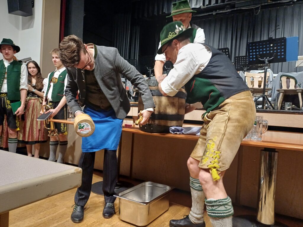 Hier begrüßte Musikmeister Sebastian Adlmaier die Besucher und bedankte sich vor allem bei Michaela Fenner und ihrem Team für die Bewirtung. Mit ein paar Schlägen (es waren wirklich nur ein paar) zapfte schließlich 1. Bürgermeister Karl Mair das Fass an und stieß mit Sebastian Adlmaier auf einen gelungenen Abend an.